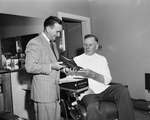 New Shop Combination - Cedric Farmer, left, lets D. T. Cowsar, his partner in the Fair Oaks Men's Shop examine a sample of the merchandise from the clothing section of the store - a barber shop-wearing apparel combination business that's the first of its kind in Fort Worth.
