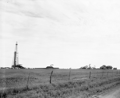 At Front Door- Nearness of the Standard Oil Company of Texas No. 1 Mrs. Minnie Adams, section 32, P. D. Adams survey, Cisco lime discovery in Floyd County, eight miles southeast of Floydada, to the farm house is shown in this photo. On the left is the well, with the barn in the center and home on the right.