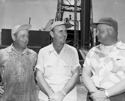At well - Gene Johnson, left, Pampa, driller on the well, is shown with R. L. Knight, center, Borger and Jim Johnson, superintendent of drilling for Cree & Johnson, contractors at the well. Johnson is a member of the firm.