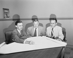 Recently elected officers of the Fort Worth Geophysical Society, left to right: E. J. Gemmill, Cities Service Oil Company, vice president; John H. Wilson, independent, president, and T. L. Kunkel, The Texas Company, secretary-treasurer. The men are sitting at a table with a large paper on it.