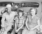 Mr. and Mrs. S. V. Adams and daughter, Glea, 11, one of five children who share in the Adams estate on whose land the prospective discovery is being drilled eight miles southeast of Floydada. While it would be the first discovery for Floyd, there is production in the southwestern part of the county. The family is sitting on the back of a car.