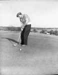 Sam Kemp putting on 14th at Meadowbrook. Mr. Kemp is wearing a hat and sweater holding a golf club on his hand. Published in Fort Worth Star-Telegram evening edition March 27, 1950.