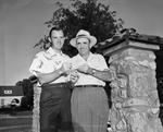 Ernie Vossler (left) and Reub Berry check scores after shooting 69s to tie for medal honors in city golf tournament at Worth Hills. Published in Fort Worth Star-Telegram morning edition June 4, 1952.