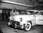 Thomas S. Byrne of Fort Worth, left, general contractor for construction of the General Motors Corporation Buick-Oldsmobile-Pontiac assembly plant at Arlington, and Mayor T. J. Vandergriff of Arlington watch a new car roll off the assembly line during the plant's formal opening. Published in Fort Worth Star-Telegram morning edition, June 4, 1954.