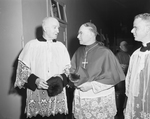 Most Reverend Thomas K. Gorman, coadjutor bishop of the Dallas Diocese, center, chats with Reverend Bernard J. Deeney, left, immediately before the celebration Wednesday of Father Deeney's fiftieth anniversary of service to the Catholic Church. Reverend Hugh Deeney, right, of La Crosse, Wisconsin, a nephew of the honored priest, was in the procession preceding the ceremony.