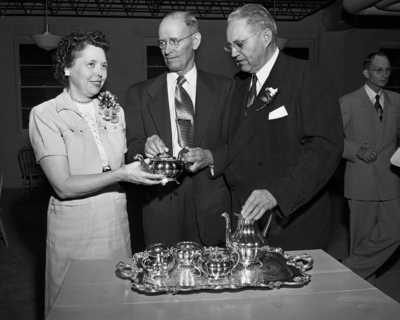 In Appreciation - Thanks for six years of devotion to Travis Avenue Baptist Church's welfare and growth is given as a six-piece silver service is presented Wednesday night to Reverend E. L. Carnett, right, and Mrs. Carnett by W. H. Shamburger, chairman of the church's deacons, on behalf of the membership.