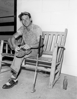 Bobby Malone relaxes after beating Bob Gilmartin in first test at city golf tournament. Published in Fort Worth Star-Telegram evening edition June 5, 1952.