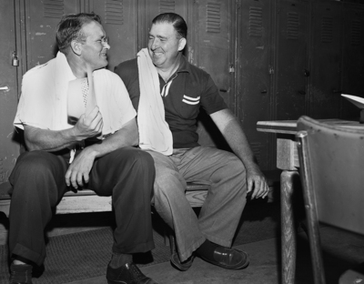 Tiny Edwards, left and Newton (Buster) Reynolds, both of whom shade the 200-pound mark by a good margin, take it easy in a cool-off session after opening city golf matches at Worth Hills. Published in Fort Worth Star-Telegram evening edition June 5, 1952.