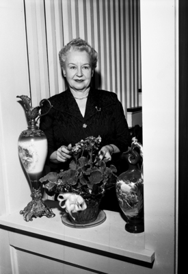 Mrs. W. Wayne Wallace, 3825 Clarke, new president of the Tarrant County Federation of Christian Churches, which will sponsor a fellowship day for the 13 Tarrant Christian churches at Riverside Christian Church. A woman tending to roses on a table in a vase.