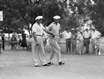 Another hot favorite, Lloyd Mangrum, right, and Herman Barron are unsmiling as they start down fairway after watching another player hit fee shot. Published in Fort Worth Star-Telegram morning edition June 12, 1952.