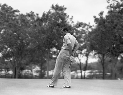 Tommy Bolt closes his eyes and makes use of "body English" as his putt rolls past the cup on the seventh green in practice. He finished with a 71. Published in Fort Worth Star-Telegram morning edition June 12, 1952.