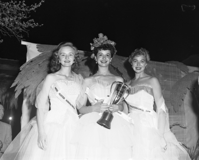 22-year-old Jean Mussato, center, daughter of Mr. and Mrs. E. A. Mussato of 4430 Foard, holds the loving cup she won Friday night as the 1952 Miss Fort Worth at a beauty pageant in Western Hills, She is flanked by Rosann Story, left, runner-up, and Vera Sue Russell, third place winner.