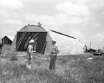 Construction near completion on a quonset- type building for storing oats on the Bert Sewell farm near Crowley. Charles Sewell, left, and Leonard Roberts, who erected the building are pictured.