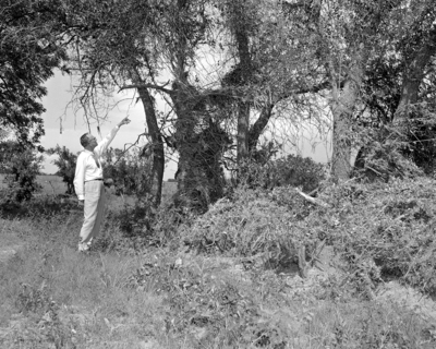Heavy Rain at Dublin. Ray Franks, Dublin businessman and stock farmer, points 10-foot-high driftwood along Green's Creek which resulted from the heavy rain of May 23 that caused extensive damange to farm land.