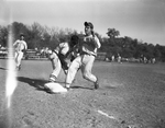First Baseman Clifton Birchman of Adamson takes a throw from the centerfielder to step on the bag just in mine to double off Louisiana Tech's Rudy Rodriquez. However, Tech shaded the Dallas team, 6-5, in the practice game.