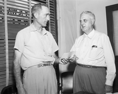 County Democratic Chairman Harry Ward, left, accepts a check for $764 from Dick Callaway, candidate for Justice of the Peace, Precinct 1, Place 2, first to pay for a place on the July 26 ballot. Callaway also was the first to file with Ward.