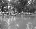 Part of the more than 100 entrants in the Southwestern Casting Championship meet being held at the Trinity Park pool this week-end warm up for the Saturday afternoon competition. The Cowtown Casting Club is host to the tournament.