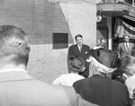 E. A. Vance, president of Fort Worth National Bank, stands in front of the marker denoting Fort Worth's first bank, in the 100 block of Houston. Members of the Tarrant County Historical Society marked the site Sunday afternoon.