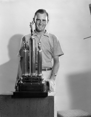 Ernie Vossler, new city golf champion, holds Dr. Alden Coffey Trophy that will be at Colonial, Ernie's home course, for next year. Published in Fort Worth Star-Telegram morning edition June 10, 1952.