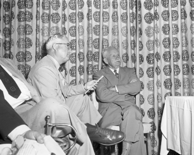 Marshall H. Kennady, left, Tarrant GOP chairman, calls for a resolution barring voters in the Democratic primary July 26 from Republican precinct conventions that day. With him at the state executive committee meeting is George C. Hopkins of Winnsboro, who telegraphed Eisenhower Monday asking him to disavow "smear tactics" of his Texas managers.