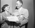Sue Bowlin receives a certificate of award for her prize-winning essay from Theron Brooks, outgoing president of the Fort Worth Sales Executives Club, at a dinner Tuesday night. The essay placed fifth in a national contest.
