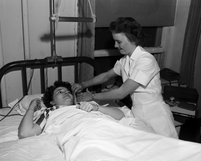 Band Leader Billye Gale gets a helping hand from Miss Mary Shepherd, 1312 Fairmount, as she recovers from injuries suffered in a car wreck.