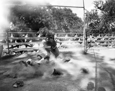 Mack Trimmier of Topsy's Cafe nine is out at home in American Legion game. Catcher is Joe Johnson of Arlington Heights' Merchants. Umpire Joe South calls play. Arlington Heights won, 3-2. Published in Fort Worth Star-Telegram morning edition, June 11, 1952.