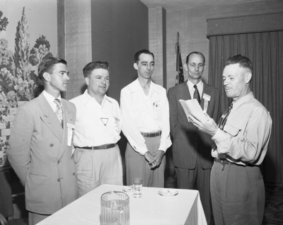 Installing Officer A. A. Ellis reads oath of office to leaders of Southwest District, Special Delivery Messengers Association. They are, left to right, Secretary-Treasurer W. R. Jefferson, Second Vice president Clayton Perkins, First Vice President Elmo Chancey and president W. L. Morland.