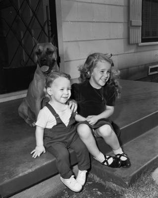 Tom L. Hardin II and Diane Kay Hardin, children of Mr. and Mrs. T. L. Hardin Jr., of 3829 Turner Road, are shown sitting with their dog Sunland Silver Slippers, a boxer.