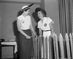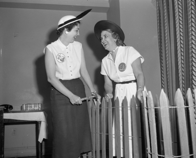 Mrs. Bill H. Emmons, left, who has a liking for Ike, and Mrs. Russell Farmer, who's pleased with Taft, swap smiles over the political fence during the Tarrant County Republican Women's Club forum Wednesday. That's a fence-mending tool, not a weapon, Mrs. Emmons is weilding.