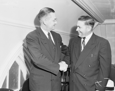 Reverend L. E. Terpstra, right, of Cranfills Gap, is shown at the Central Texas Methodist Conference in Waco as he was congratulated by Reverend C. C. Sessions, Gatesville district superintendent, upon receiving a certificate of merit for outstanding rural church work.
