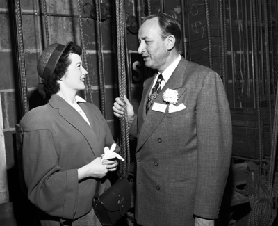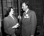 Pretty Pat Jenkins, New York actress, and R. J. West, supply corporation district manager for General Electric, chat backstage between scenes of "Birth of a Salesman," presented for GE dealers from three states in Will Rogers Memorial Auditorium.