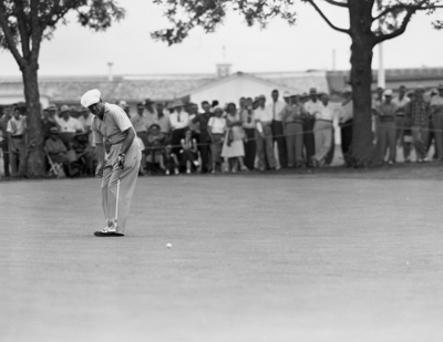 Lloyd Mangrum is shown putting. He is holding his golf club as a crowd behind him watches him in action. Published in Fort Worth Star-Telegram evening edition June 12, 1952.