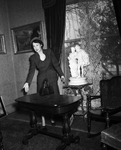 Mrs. Elizabeth N. Carlson of 3300 Worth Hills, (Wife of O. G. Carlson) an enthusiastic antique hunter, shows how she will cut down to coffee table size this fine old Empire library table from the home of Mrs. M. M. Barnes. Lace curtains from Sweden and statuary in background are among decorative keys to the room.