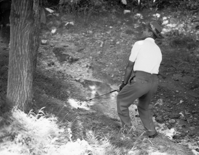 Sam Snead, in deep trouble on the 10th hole at National Open second round, digs the ball up and out of the water. The ball struck a tree on the opposite side of the green and fell back to leave Snead a 25-foot putt, which he missed. Sam, even par, shot a 75. Published in Fort Worth Star-Telegram morning edition June 14, 1952.