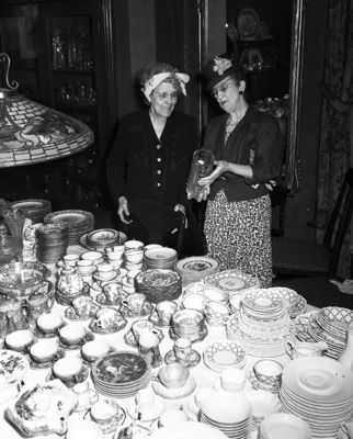 Mrs. Leona Scott Long of Archer City, right, who sued in an unsuccessful attempt to break the will of her cousin, Mrs. M. M. Barnes, is pictures displaying a cut glass vase which she purchased, to her sister, Mrs. Jeanette Scott Taylor, who resided with Mrs. Barnes prior to her death.