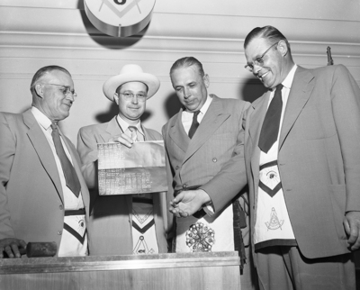 Members of Riverside Masonic Lodge 1194 prepare to burn a $15,000 note on their building Saturday night. Left to right are Grady Carter, past master and past district deputy grand master; Rue S. Hestand, worshipful master; Horace K. Jackson of Gatesville, past grand master of the Grand Lodge of Texas, and Harlon Wright, past master.