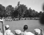 Julius Boros, the new National Open champion, sprints happily toward the cup after seeing his ball drop for a difficult par on the 16th hole of the final round. The North Carolina pro played steady golf throughout the tournament, finished with a one-over-par 281 to win the championship. Published in Fort Worth Star-Telegram morning edition June 15, 1952