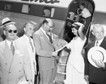 David Goitein, center, Israeli minister to the United States, receives a key to the city from Miss Fort Worth, Jean Musato. Another key figure in welcoming the minister to Fort Worth Sunday afternoon was A. B. Canning, left, honorary chairman of the city's observance of Israel's fourth year of independence. Behind them is an airplane.