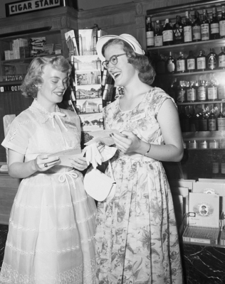 Two delegates to the Grand Assembly of Texas, Order of the Rainbow for Girls, search for postcards to send home to family and friends in El Paso. They are Helen O'Shaughnessy, left, a junior member of the grand credentials committee, and Agene Lynch, a grand representative.