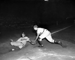 Bob Kline, Beaumont second baseman, slides across home plate with what proves to be the winning run against the Cats in the eighth inning. The Fort Worth catcher is Steve Lembo. Published in Fort Worth Star-Telegram morning edition, June 16, 1952.