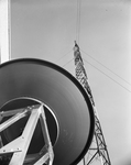 Arrow indicates final position of reflector screen perched 275 feet above ground on the tower at WBAP-TV. Inset is closeup of screen. The installation is part of altercations which will permit viewers to get their first direct network programs early next month. Looming large at bottom is parabolic antenna which channels the signal into the studio.