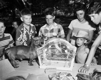 Fancy Meeting You Here - "Mabel", pet Dachshund of Troy Rife, 208 Lindenwood (in plaid shirt), and his brother Joe (in straw hats) meets a pal from home in this blue parakeet, also owned by the two boys. Both animals were entered in the pet show Tuesday in Monticello Park. Looking on are Fred Wallace, 3920 Monticello, left, and Leon Hill, 104 Lindenwood, right. The recreation department-sponsored show was typical of activity in all city parks as children prepare for the citywide show Saturday at Burk Burnett Park.