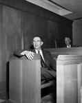 Under Fire - A. B. Carter, left, directs his answer the jury box Tuesday during the course of his hour and 43-minute session on the witness stand while on trial for allegedly receiving illegal fees. Criminal District Court No. 2 Judge Dave McGee listens intently from the bench.