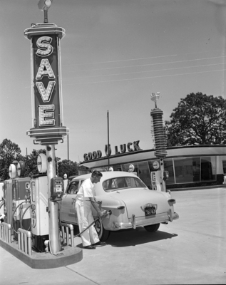 New Service Station - E. O. Yeates, manager of the new Good Luck service station at 3812 E. Belknap opening formally Friday, fills up the tank of an early customer. The station is the first of the Good Luck system in Fort Worth.