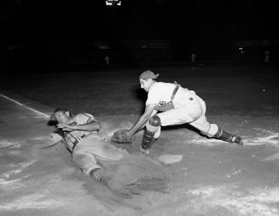 First baseman Jerry Witte of Houston is nailed at play by catcher Steve Lembo of Cats on throw from first baseman Wayne Belardi in third inning of second game. Published in Fort Worth Star-Telegram morning edition, June 19, 1952.