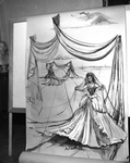 This is the winning entry in the display division of the Advertising Art Annual Exhibition at the Fort Worth Art Association gallery in the Public Library. It is the work of George Grammer. The show will be in the gallery. A painting of woman in dresses and sheets are all around the area in the painting.
