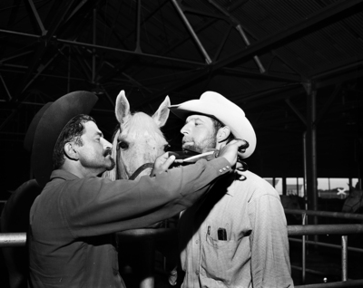 Cowboy Clipping - Louie Kosta, left, a hairdresser-turned-cowboy, reaches across Butterfly, the horse, to trim the beard of Keith Wiley, an electrician-cowboy. The men are Jaycees who traveled by mule wagon from Colorado to Texas.