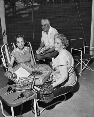 Displaying mementos and the results of their shopping are, left to right, Mrs. Thomas L. Yates and Yate , 3616 Westcliff Road N., and Mrs. W. F. Cowden, 2501 Rogers Road. Their 16 day cruise took them to La Guaira, Puerto Cabello and Guanta in Venezuela; to Port of Spain in Trinidad; to Kingston, Jamaica, and Curacao in the Dutch West Indies.