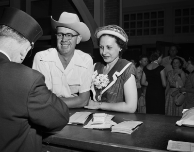 Tickets Please - Mr. and Mrs. Cleat Cockrell, 3621 Suffolk Drive, have their tickets checked by Pullman Conductor C. R. Condit before boarding the Lions Club special train to Mexico City Friday night.